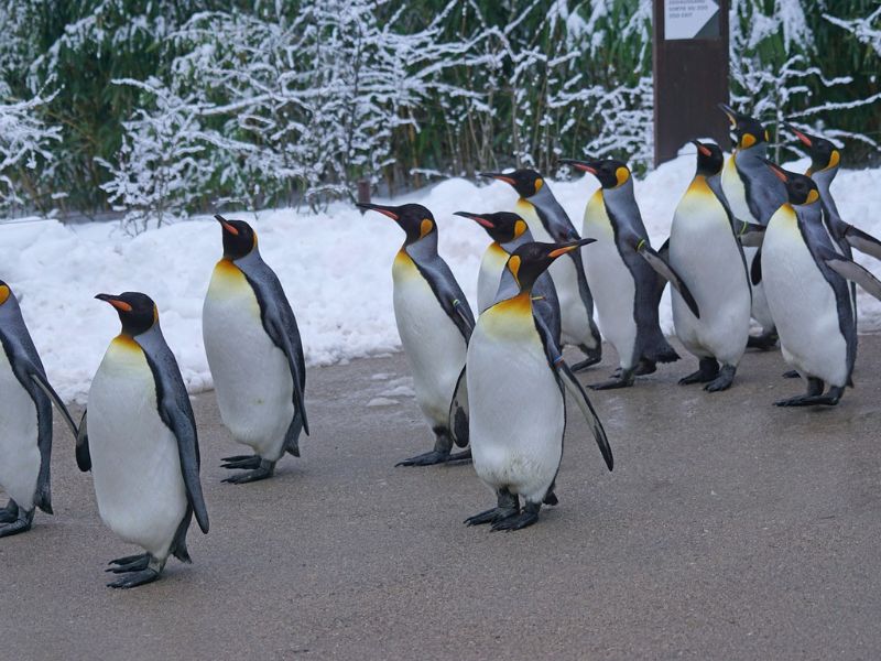Moreover, their backs are usually all black, while their fronts, excluding the head, are predominantly bright white. This characteristic appearance, resembling a tuxedo, is common among various penguin species.