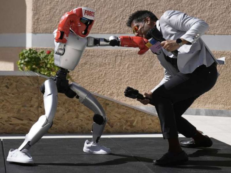 The Unitree G1 robot plays boxing with Aadeel Akhtar CEO and Founder of Psyonic at the first International Humanoid Olympiad at the Olympic Academy, in ancient Olympia, Greece, Monday, Sept. 1, 2025. Image Credits: AP Photo/Thanassis Stavrakis