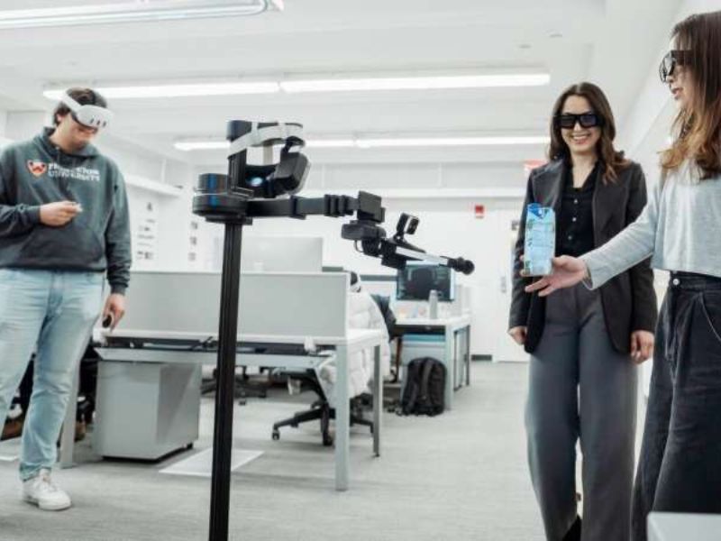Computer scientists Parastoo Abtahi, center, and Mohamed Kari, left, are are working to bring virtual reality into the physical world by pairing mixed reality headsets with robots. Doctoral student Lauren Wang, right, assists in demonstrating how the robot operates. Image Credits: Nick Donnoli/Orangebox Pictures
