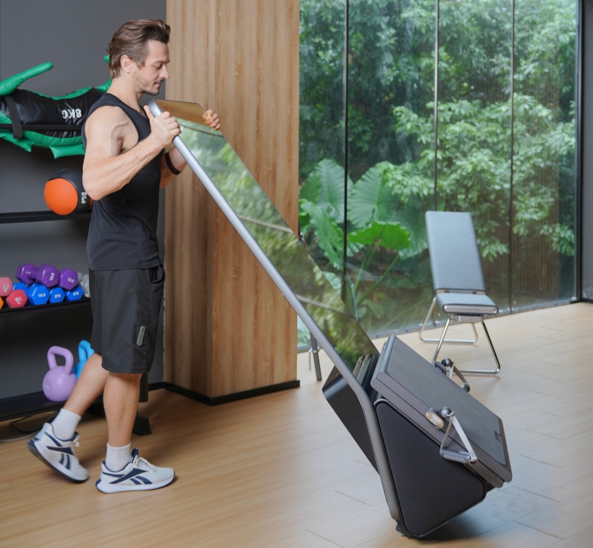 Now featured on Kickstarter, the K1 boasts a 43-inch vertical 4K touchscreen with built-in surround sound. This screen connects to an electronic base module, which links to a foldable floor platform, creating a seamless workout setup.