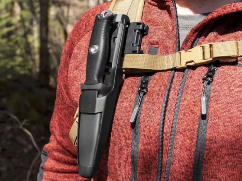 Instead of incorporating additional tools within the handle, as is the case with traditional Swiss Army knives, it integrates fire-starting tools and other features into the carrying system. This approach maintains a clean and seamless grip on the knife while introducing a few functions that could potentially save your life or simply assist you in emulating survival scenarios like those seen on “Man vs. Wild.”