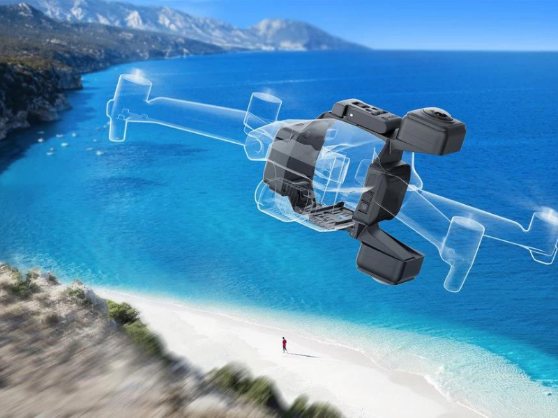 The space between the lenses means that the 360 camera system can record footage while having the drone become basically invisible, allowing the surroundings to be seen from all angles.